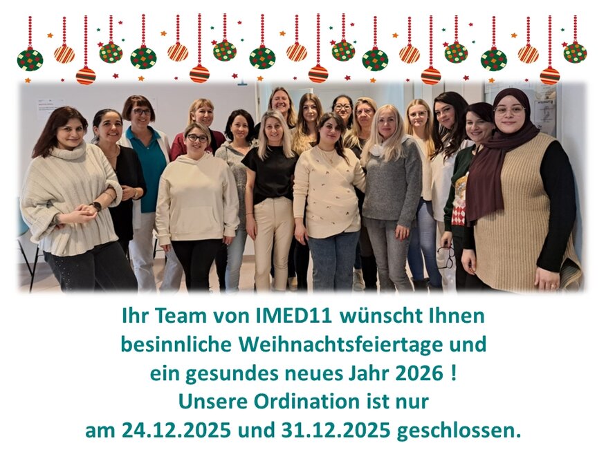 ![]() | Ihr IMED-11 Team wünscht Ihnen besinnliche Weihnachtsfeiertage und ein vorallem GESUNDES neues Jahr 2023 ! Unsere Ordination ist vom 27.12.2022 bis 30.12.2022 und vom 02.01.2023 bis 05.01.2023 geöffnet. |